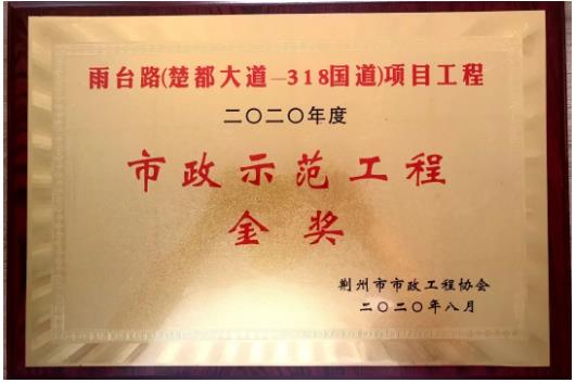 近日,由武漢建工路橋分公司承建的雨臺路(楚都大道-318國道)項目、福陽路(雞公山路-濱河路)項目,分別獲評“2020年度荊州市市政示范工程金獎”。