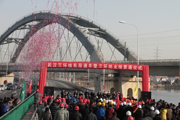 2010年12月30日,三環(huán)線東段暨全線正式通車,形成武漢市內(nèi)首條全線通車的快速環(huán)線通道。市政府在三環(huán)東段起點舉行了隆重的通車慶典,武漢建工的彩車載著武建人的喜悅和自豪行使在慶典的車隊之中,沿著寬闊和通暢的道路向前奔馳。